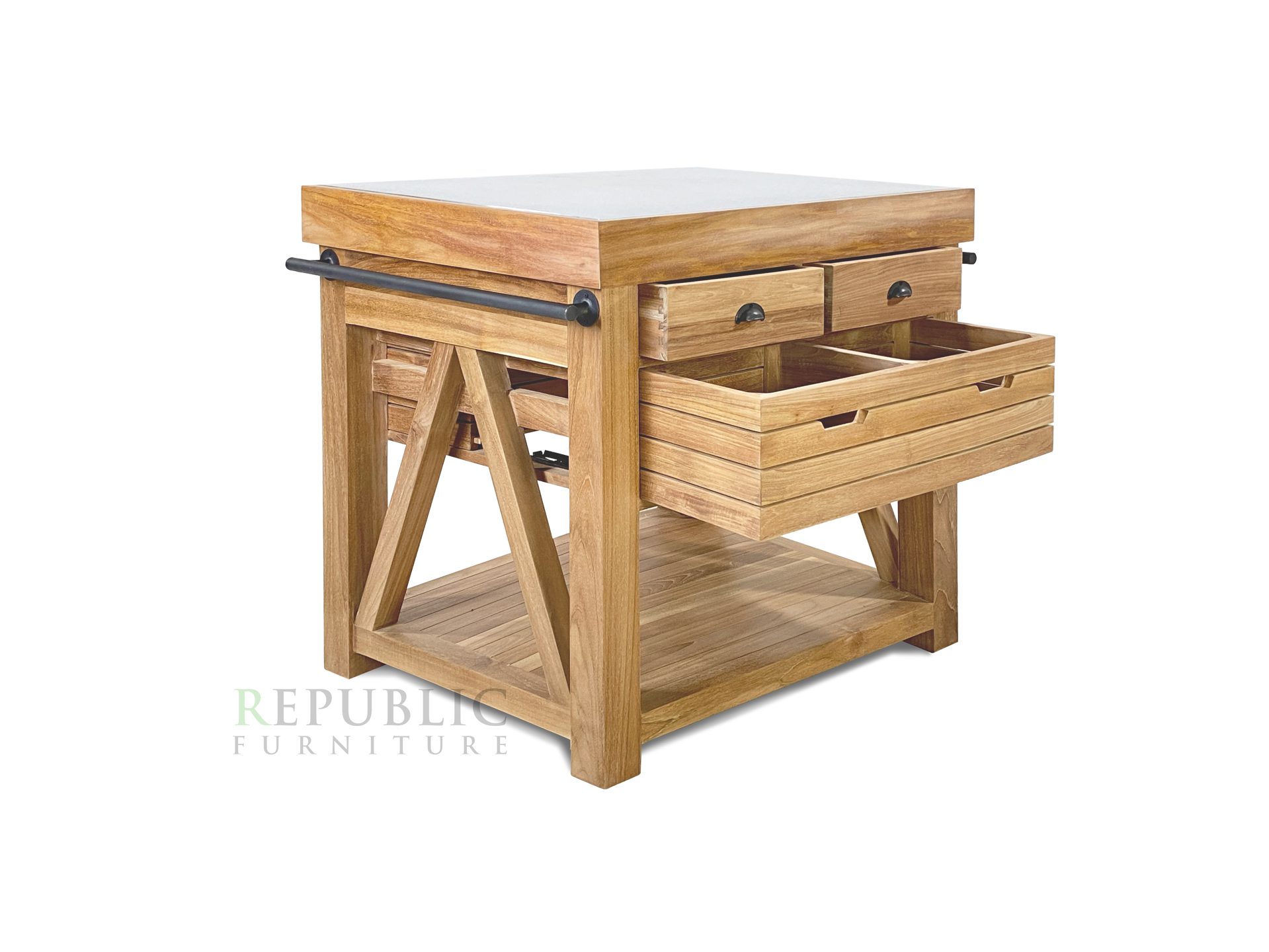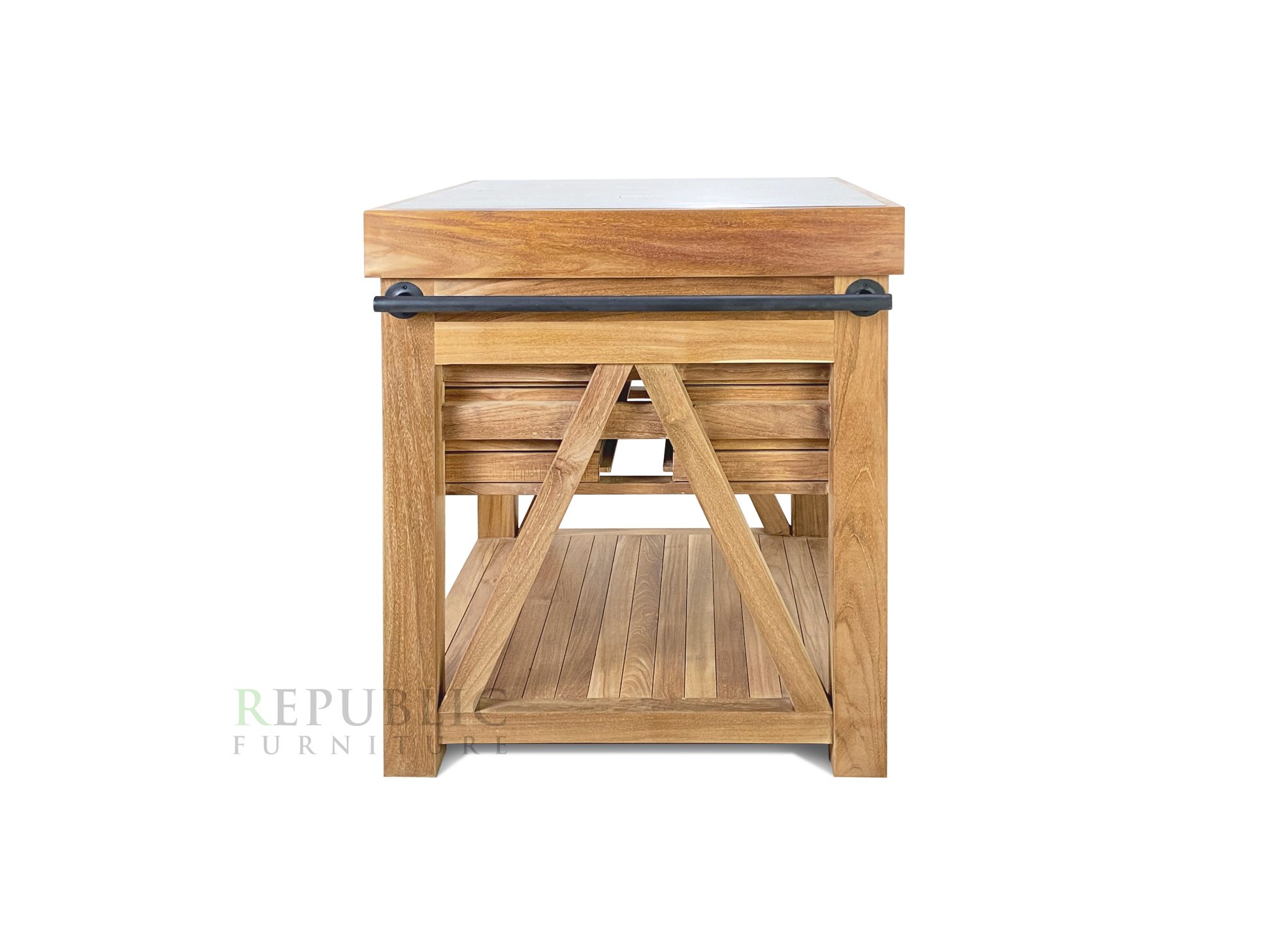 Teak Outdoor Kitchen Ardan by Republic Furniture is a compact yet functional outdoor kitchen unit designed to enhance your outdoor living space with both style and practicality. Crafted from premium solid teak wood sourced from Jepara and combined with durable aluminium, this piece offers excellent resistance to outdoor conditions while maintaining a warm, natural aesthetic.