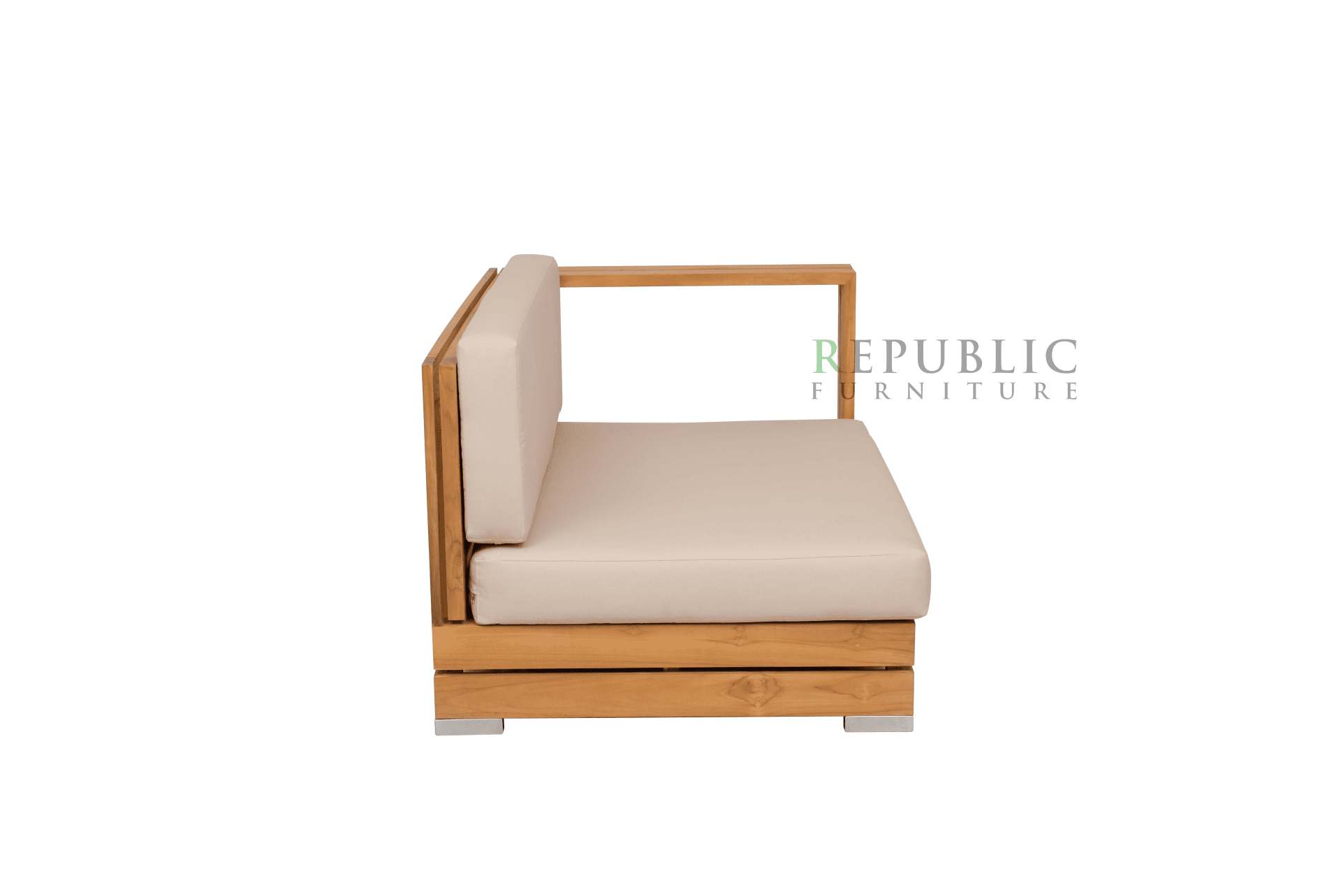 Teak Outdoor Left Deep Seating Korsika by Republic Furniture is a refined single-seat outdoor sofa designed to elevate comfort and style in any open-air setting. Crafted from solid Jepara teak wood, this left-side deep seating sofa offers generous proportions for relaxed lounging while showcasing the natural beauty of premium teak.