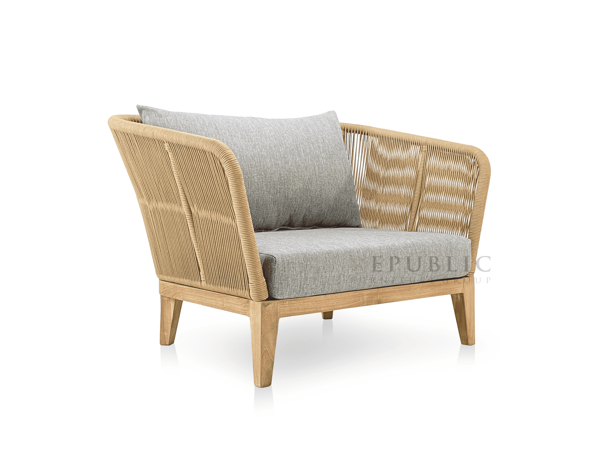 The Teak Outdoor Single Deep Seating Anabela by Republic Furniture is a refined single-seat outdoor sofa designed to deliver exceptional comfort with a contemporary tropical touch. Crafted from solid Jepara teak wood and complemented by durable rope detailing, this deep seating chair offers a perfect balance between natural elegance and modern outdoor living.
