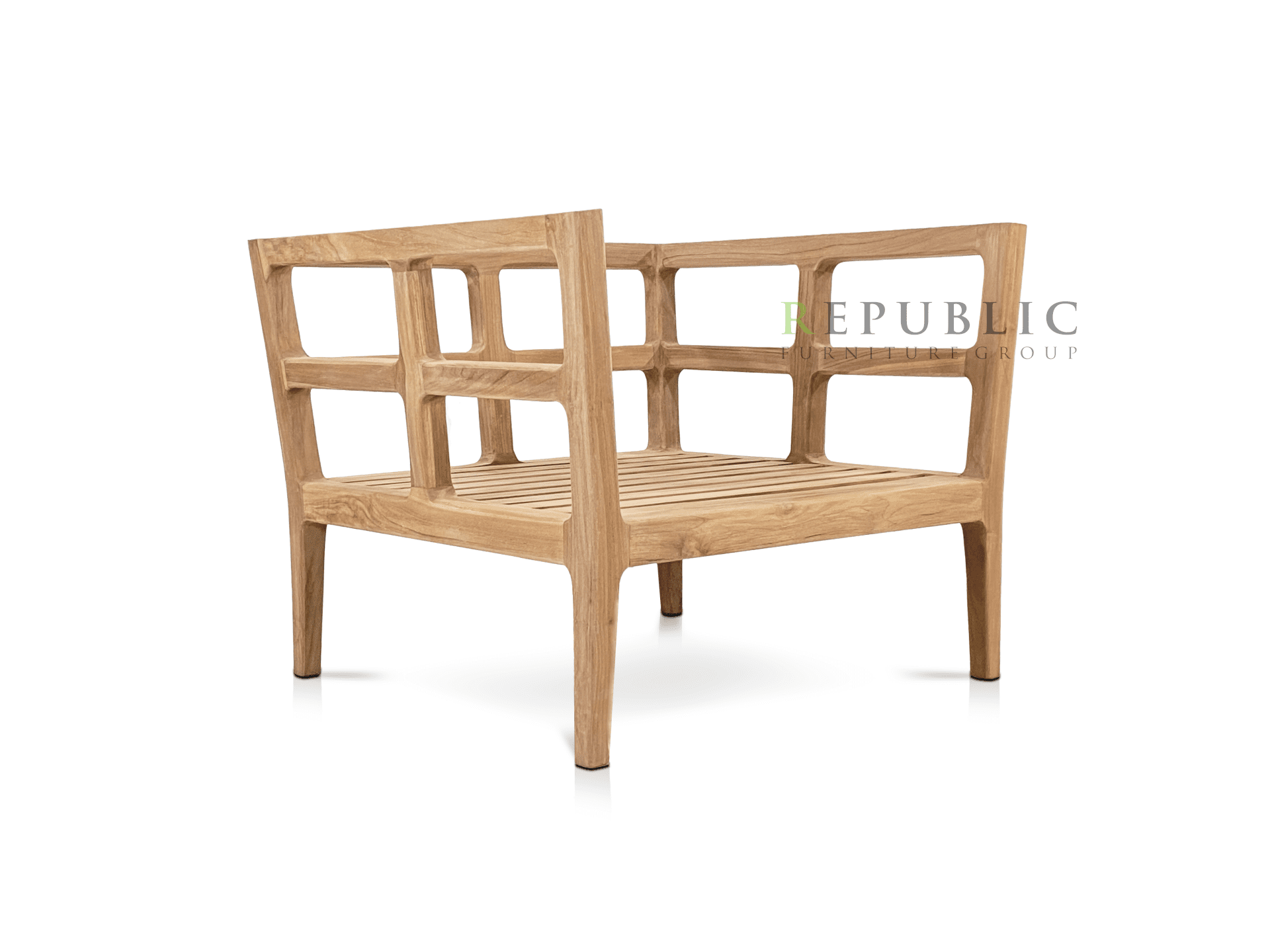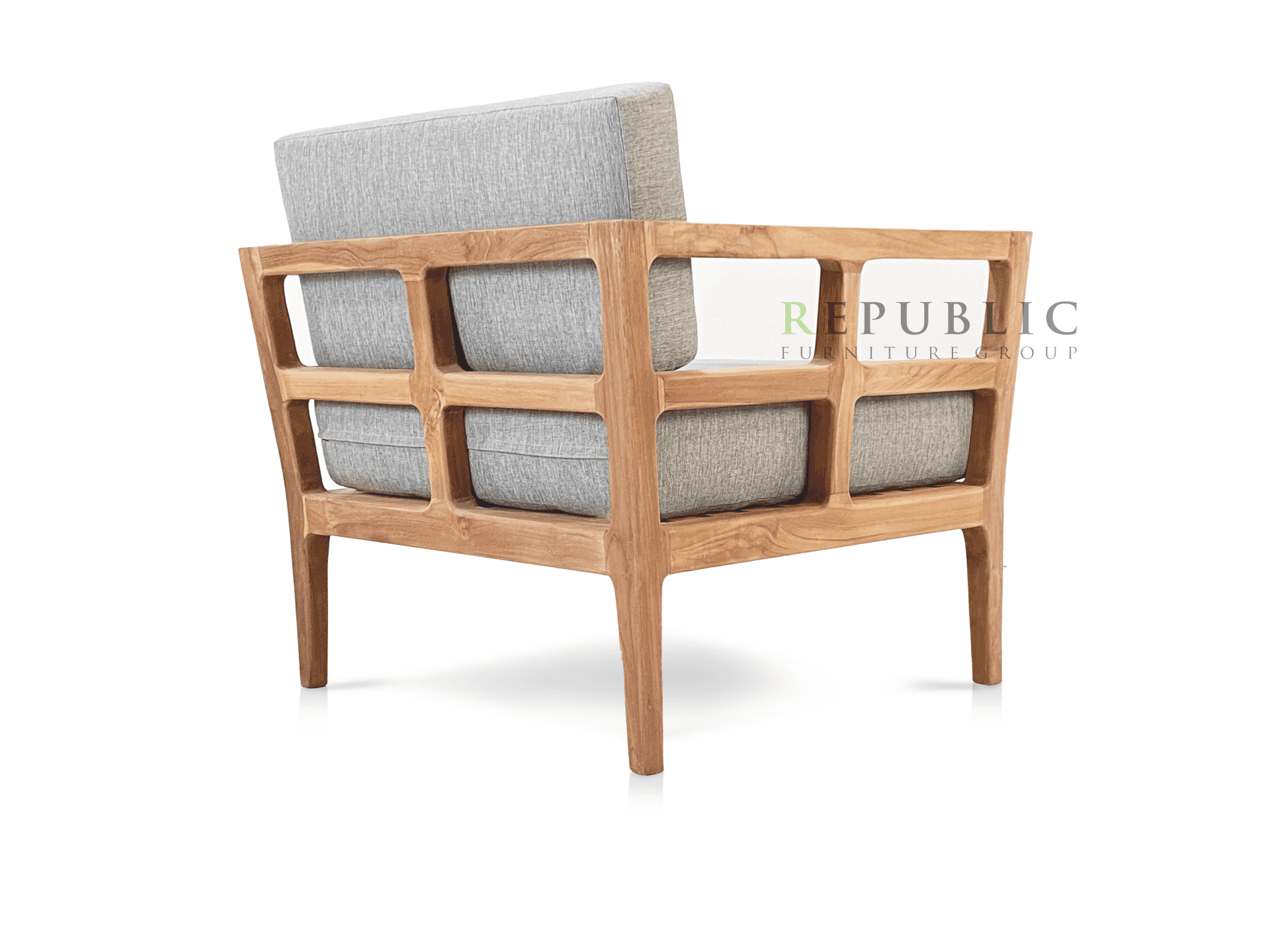 Teak Outdoor Single Deep Seating Geya by Republic Furniture is a refined single-seat deep seating sofa designed to elevate outdoor relaxation. Crafted from solid Jepara teak wood and paired with a comfortable sunproof cushion, this piece offers generous seating depth, excellent durability, and timeless natural aesthetics.