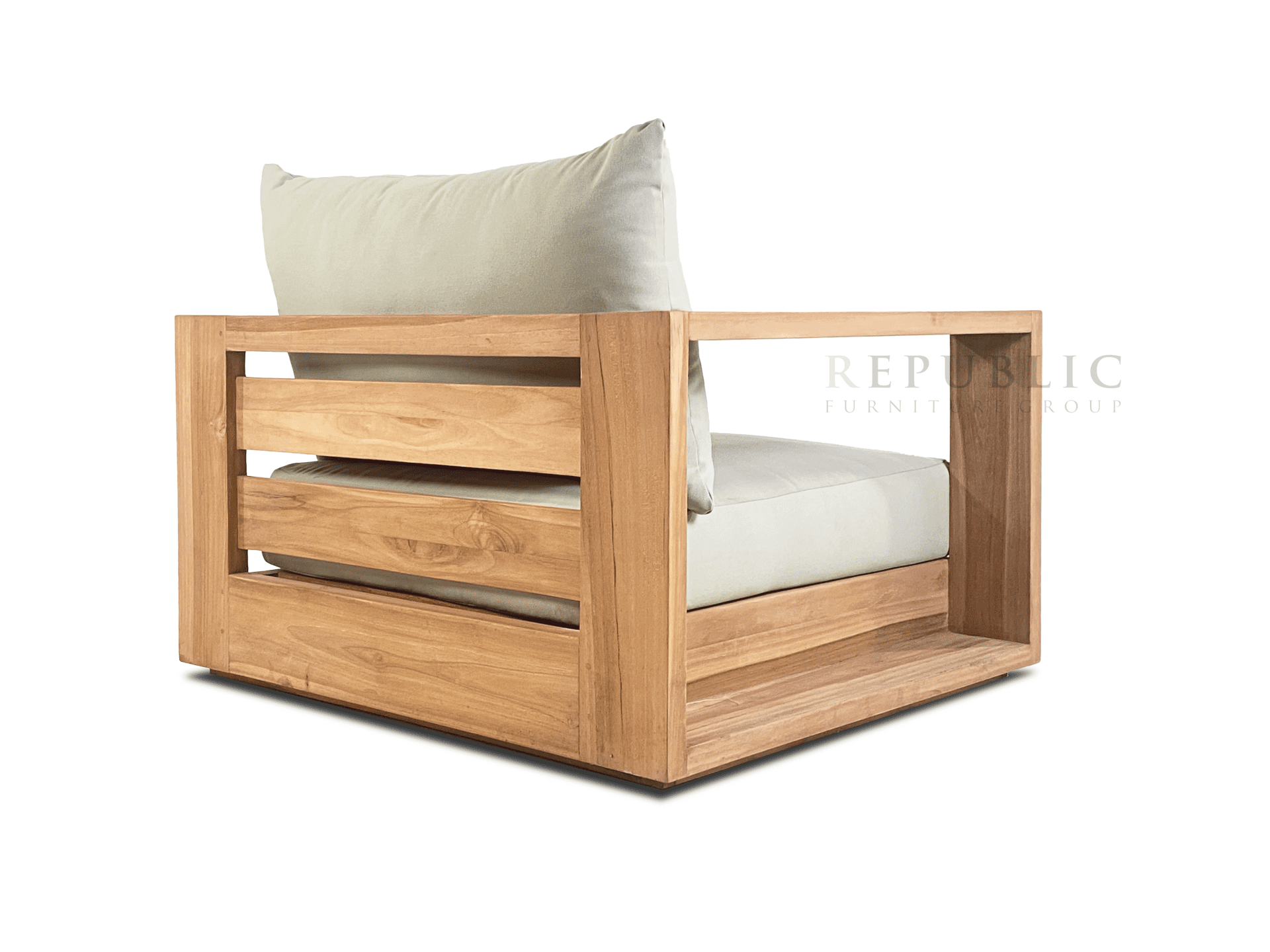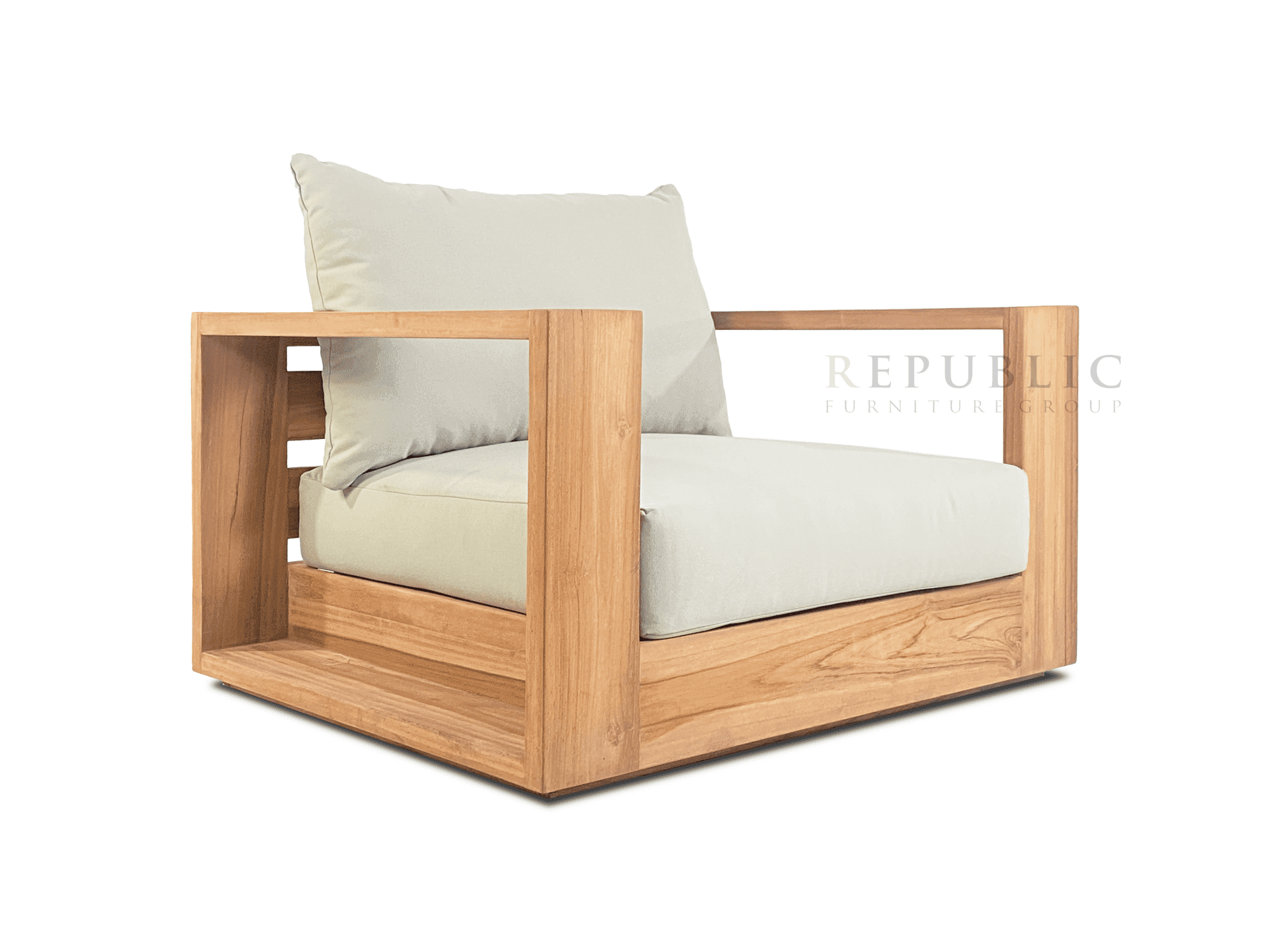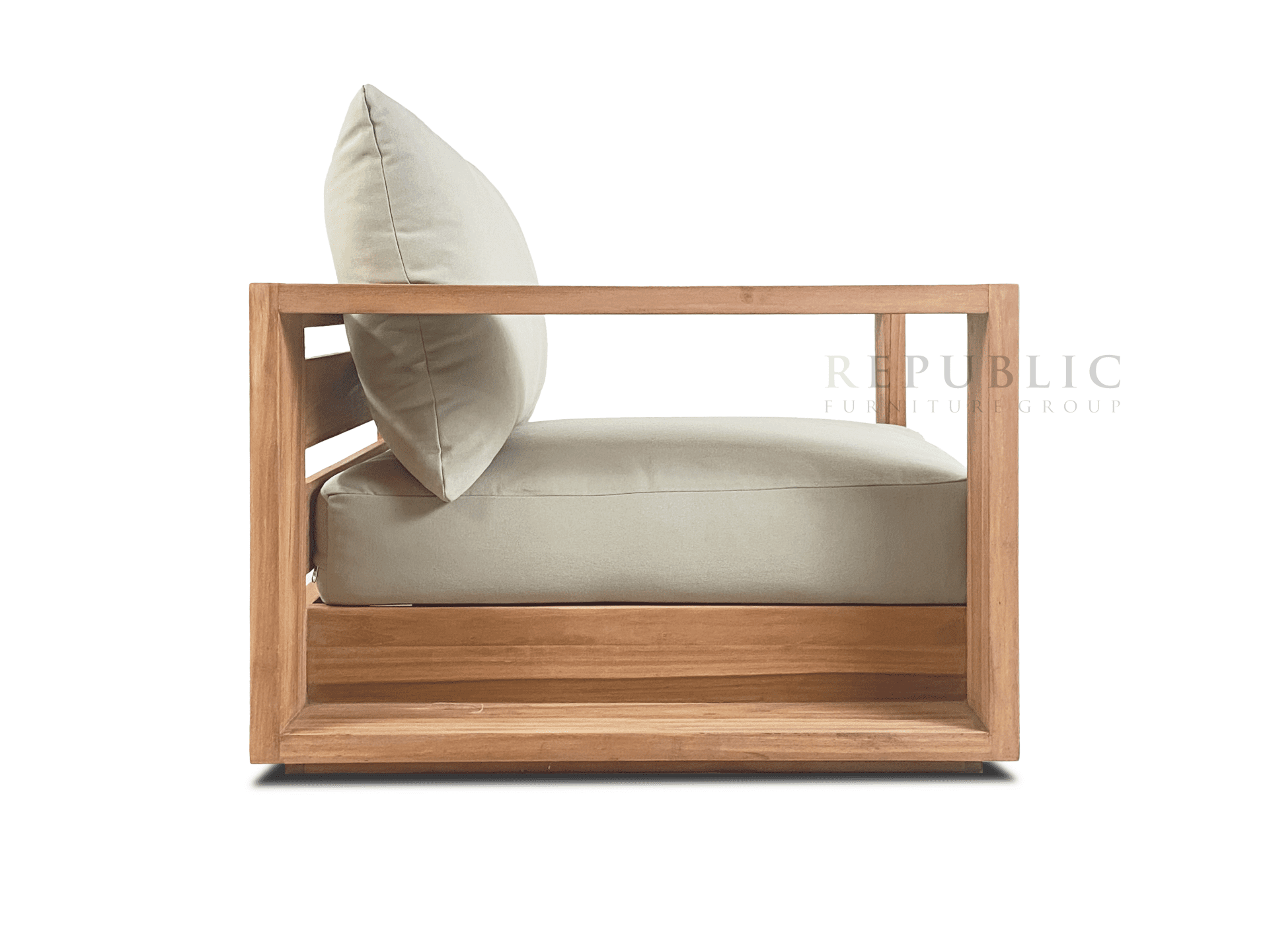 The Teak Outdoor Single Deep Seating Kosa by Republic Furniture is a refined outdoor deep seating sofa designed for ultimate comfort and timeless style. Crafted from solid Jepara teak wood and paired with a sunproof cushion, this single-seat sofa offers a perfect balance of durability, natural beauty, and relaxation.